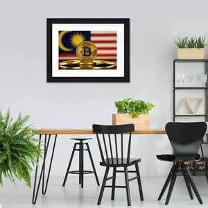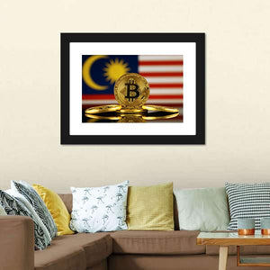 This canvas art features a close-up of bitcoin coins set against the vibrant backdrop of the Malaysia flag. Its modern, abstract design conveys a financial mood, making it a striking addition to your wall decor.