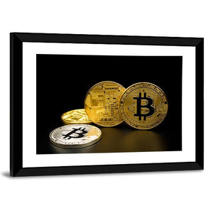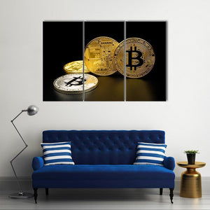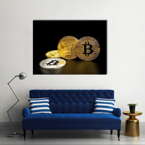 This canvas artwork features a close-up composition of a silver bitcoin alongside three gold bitcoins. It embodies a luxurious and modern vibe that fits beautifully in any contemporary space.
