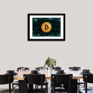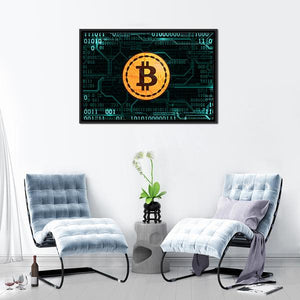 Centered on a gold-circled bitcoin logo, this canvas blends binary code with a green circuit-board pattern against a black and gold palette for a digital, modern mood. Its abstract, tech-forward look suits home offices, studies, or other contemporary wall decor.
