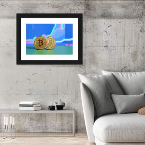 Two gold bitcoin coins rest on a green surface with a softly blurred financial graph in the background. The centered composition reads modern and abstract, with blue, pink, and red accents that give a financial, contemporary mood. It suits modern home decor and room displays that favor technology or cryptocurrency themes.