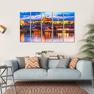 Capture the beauty of Prague with this canvas art featuring St Vitus Cathedral alongside vibrant reflections in the Vltava River. The scene is filled with colorful hues of blue, yellow, and orange, creating a serene and magical atmosphere.