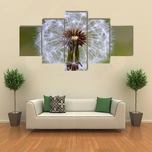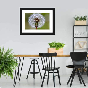 Dandelion Seeds Ball Canvas Wall Art shows a close-up of a dandelion seed head with individual seeds and parachutes and the brown center, set in soft white and green tones. The photorealistic, modern image feels delicate, peaceful, and serene—suitable for modern living rooms or bedrooms.