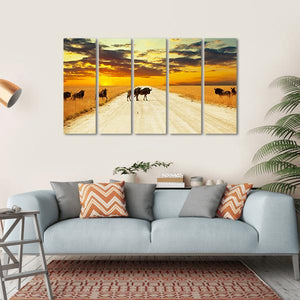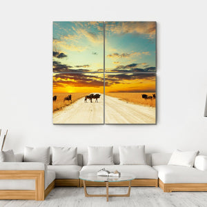This stunning artwork features a herd of wildebeest traversing a dirt road across the African savanna at sunset. The peaceful, serene scene captures the majestic beauty of nature, enhanced by an earthy palette of orange, blue, and yellow that brings warmth to any space.