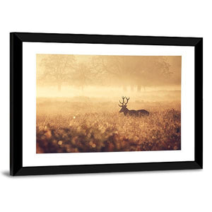 This artwork features a majestic red deer stag silhouetted against a serene autumn mist. The ethereal landscape, with soft fog enveloping fields and trees, creates a peaceful atmosphere that invites reflection.