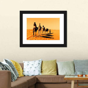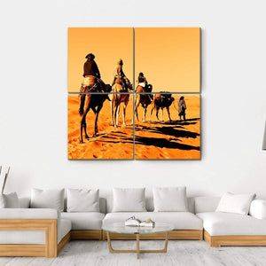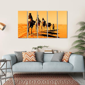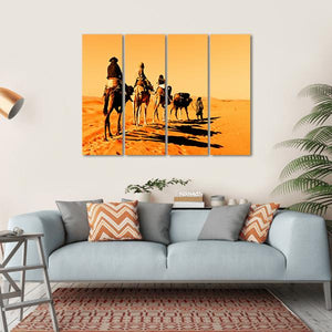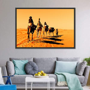 This canvas art captures a caravan of camels journeying through the serene Sahara Desert, framed by dramatic lighting. The warm palette of orange, brown, and yellow evokes an adventurous spirit while inviting a sense of calm into your space.