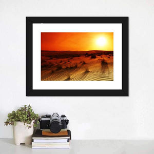 Capture the serene beauty of a desert sunset with this art piece that features vibrant orange, red, and yellow hues. The warm tones and peaceful scene of rippled sand dunes and sparse vegetation create a tranquil atmosphere, perfect for any space.