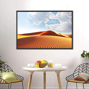 Photorealistic canvas depicting rippled sand dunes beneath a blue sky dotted with fluffy white clouds, evoking a serene, vast, arid mood. Warm oranges and sandy browns balanced by cool blues and whites make this piece a quiet fit for modern interiors and contemporary room decor.