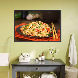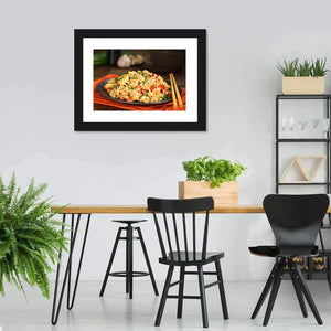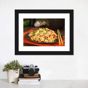 This canvas features a close-up food photography shot of fried rice with chicken, red bell peppers, peas, egg and wooden chopsticks. Warm, appetizing tones of brown, white, green and red create an inviting mood that fits kitchens, dining rooms, modern homes, or restaurant walls. The shallow depth of field highlights the texture and color of the meal.
