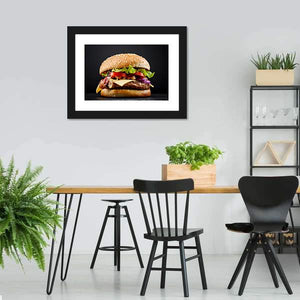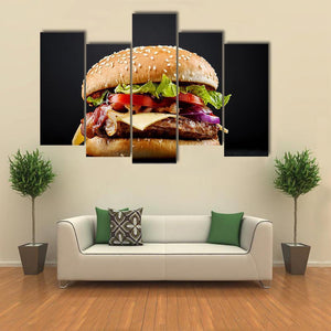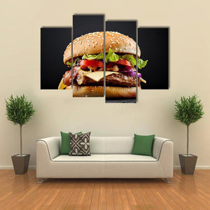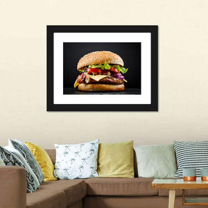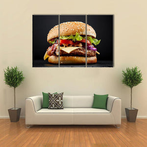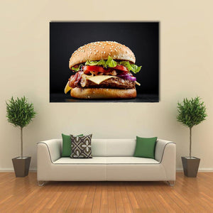This canvas features a centered, photorealistic hamburger with a sesame seed bun, lettuce, tomato, onion, cheese, bacon and a beef patty. The image reads appetizing and bold, with a palette of browns, greens, reds, yellow and white. It fits house and restaurant wall decor or modern, colorful rooms looking for food-themed art.