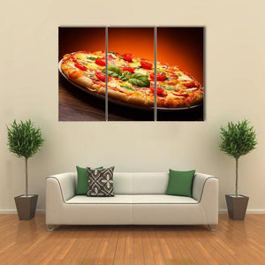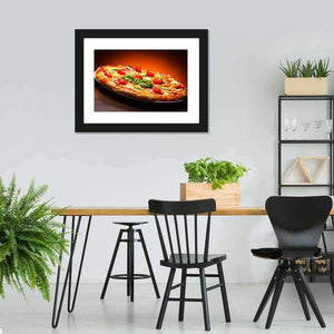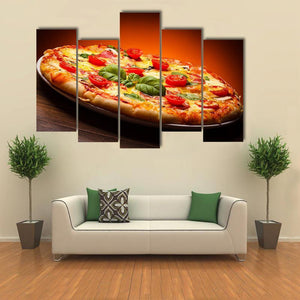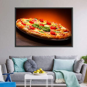 This canvas shows a close-up, angled view of a hot and spicy pizza with cherry tomatoes, basil leaves, melted cheese and crust. The vibrant red, yellow, green and brown palette creates an appetizing, vibrant mood that fits kitchens, dining rooms or casual restaurants.