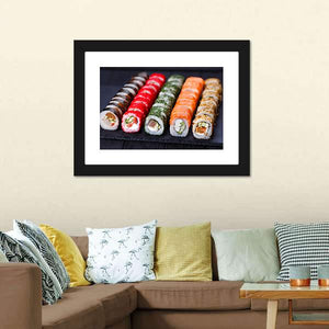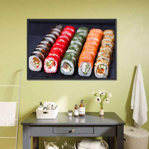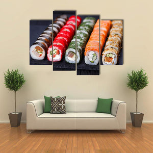 This canvas shows five different sushi rolls in a close-up, diagonal arrangement against a black slate background. The modern food photography uses red, orange, white, green, and brown tones for an appetizing, vibrant, fresh feel — a good fit for kitchens, dining areas, or restaurant walls.