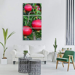 This canvas shows three ripe pomegranates hanging from a branch in a realistic botanical style, capturing a fresh, vibrant, natural mood. Rich reds, verdant greens, and warm browns bring a summery, daytime feel that fits modern, nature-inspired rooms like kitchens, dining areas, or casual living spaces.