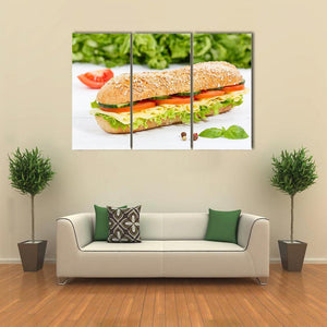 Close-up, eye-level image of a sub sandwich with cheese and fresh vegetables, including lettuce, tomato and cucumber, with sesame seeds, a basil leaf and visible peppercorns. The realistic food-photography print feels fresh, healthy and appetizing and works well on kitchen or dining room walls.