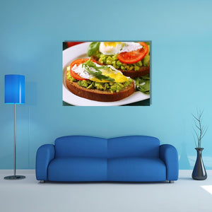 This canvas art features a mouthwatering close-up of avocado toast topped with a poached egg, fresh sliced tomato, and arugula. The vibrant palette of green, brown, and red creates an appetizing and healthy vibe, perfect for brightening up your kitchen or dining area.