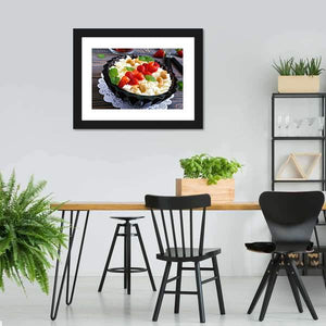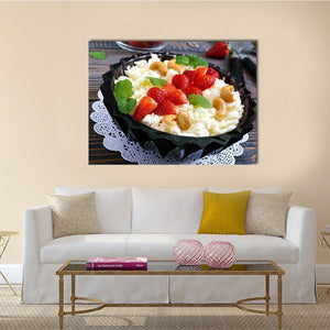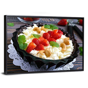 This canvas art features a close-up view of a bowl filled with cottage cheese or rice pudding, beautifully topped with strawberries, cashews, and fresh mint. The vibrant colors create an appetizing and sweet atmosphere, making it an inviting addition to any kitchen or dining area.