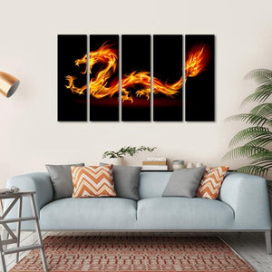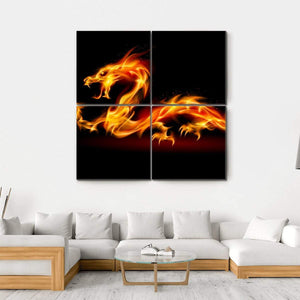 This dynamic canvas features a fiery dragon, depicted through a modern and abstract lens. Its powerful presence, adorned with glowing embers and intricate scales in orange, yellow, and black, creates a mythical atmosphere perfect for any wall.
