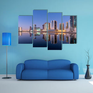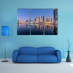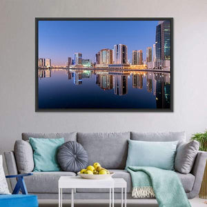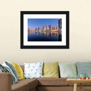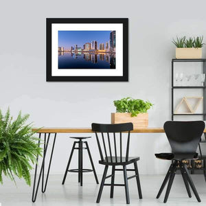 Dubai’s skyline glows at night in this modern cityscape print, with illuminated buildings mirrored in a clear canal reflection. Cool blues, whites and touches of yellow give a calm, urban mood that suits modern living rooms and offices.