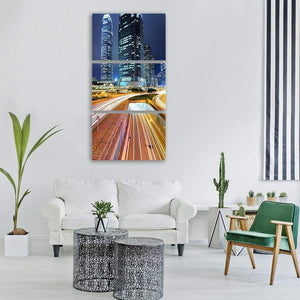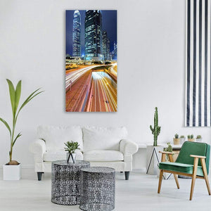 A cityscape of Dubai at night showing the skyline and a highway with streaking headlights and taillights. Cool blues with pops of orange, yellow, and white create a modern, energetic nocturnal mood with strong leading lines and depth of field. Suited to contemporary living rooms or offices as a vibrant urban accent.