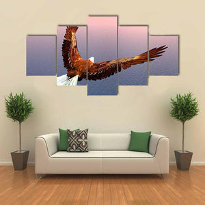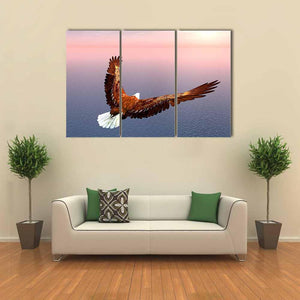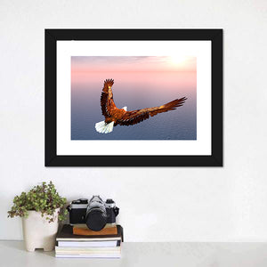 This stunning canvas art showcases an eagle in flight, capturing a moment of majesty and freedom. The warm palette of browns, whites, and blues, complemented by sunlit clouds and a vast ocean below, creates a powerful and realistic depiction that enhances any space.