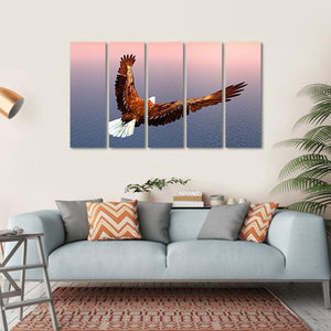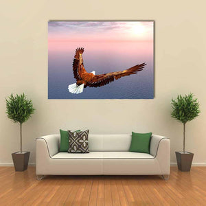 This canvas art features a majestic eagle soaring through the sky, its wings spread wide against a vibrant sunset. The rich browns and soft blues create a serene atmosphere, perfect for bringing a touch of nature into your space.