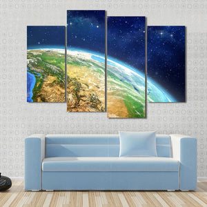 This stunning canvas art captures a breathtaking view of Earth from space, showcasing North America amidst a cosmic landscape. With its realistic and photorealistic style, this piece evokes a sense of wonder and awe.