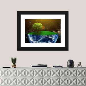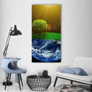 Depicts a split scene: a lone tree on a grassy mound beside Earth seen from space against a starry background. Blue, green and black tones with a wash of yellow create a serene, vast, cosmic feeling. Its modern, surreal style suits modern or contemporary rooms and quiet spaces.