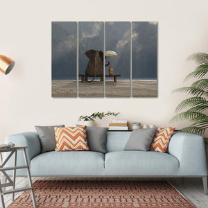 This whimsical canvas features an elephant and a small dog sharing an umbrella on a rainy beach day. The composition evokes a sense of melancholy and companionship, perfect for adding a thoughtful touch to any wall.