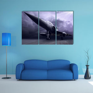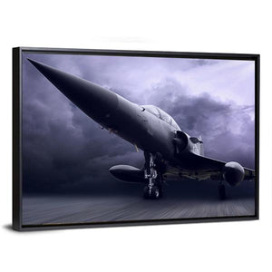 This striking canvas art showcases a powerful fighter jet soaring through a stormy sky, captured from a dynamic low angle. Its dramatic palette of grey, purple, and black enhances the intensity of this modern piece, making it a compelling addition to any wall.