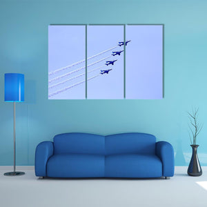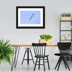 This captivating canvas depicts four blue jets in formation, creating graceful smoke trails against a vibrant blue sky. Its dynamic composition invites a sense of motion and energy, making it a perfect fit for a modern space.