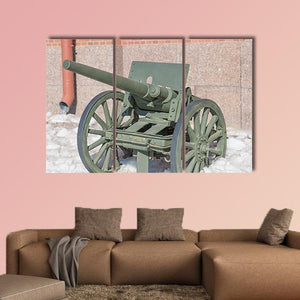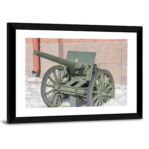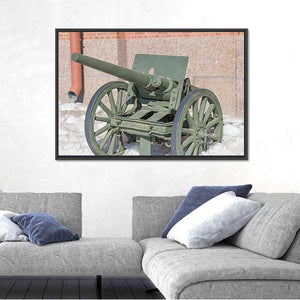 Old Cannon Russia Canvas depicts a field artillery cannon with its spoked wooden wheels and barrel set in a snowy field in Russia. Seen at eye level and centered, the realistic, vintage treatment and muted green, brown, white, and grey palette convey a historical, weathered mood. It fits well in a study, den, or room with military or vintage decor.