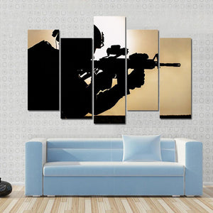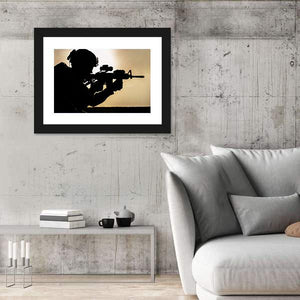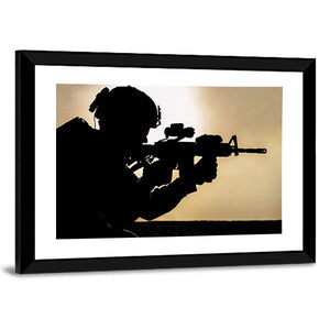 This striking canvas art depicts a soldier in silhouette, wearing a military helmet against a dramatic sunset backdrop. Capturing an intense and determined mood, it adds a powerful statement to your wall decor.