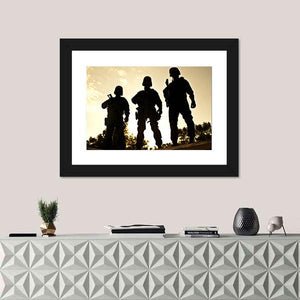 This striking canvas art features silhouettes of three soldiers holding rifles against a dramatic sunset backdrop. The serious and vigilant mood captures a sense of duty and strength, making it a compelling addition to modern military-themed decor.