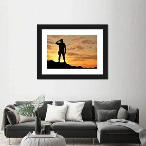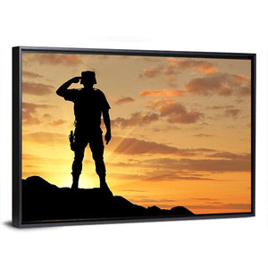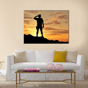 This canvas wall art features a soldier saluting against a stunning sunset backdrop. The silhouette captures a patriotic and contemplative mood, blending warm hues of orange and yellow with deep black. It's an inspiring piece perfect for any military enthusiast or as a statement in your home decor.