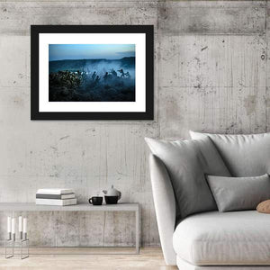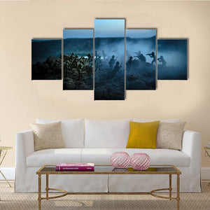 This canvas depicts toy soldiers in battle amid low-lying smoke and a dark, dramatic landscape. The blue‑green‑gray palette and dramatic lighting create an intense, somber mood that suits modern or military‑themed room decor.