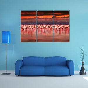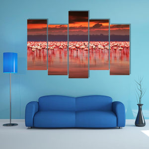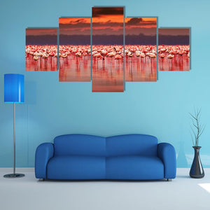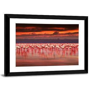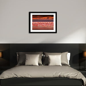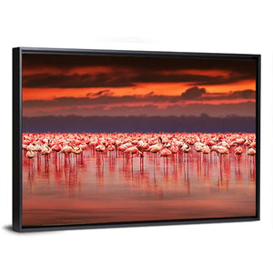 This canvas wall art captures a stunning scene of flamingos at a serene lake during a sunset. The rich palette of pinks, oranges, and blues evokes a peaceful atmosphere, making it an ideal addition to your space.