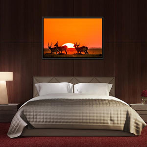 This vibrant canvas art features a silhouetted antelope against a stunning sunrise, evoking a peaceful and majestic atmosphere. With colors of orange and yellow, it brings a touch of the savanna into your space.