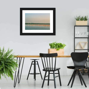 This serene canvas captures a large flock of flamingos wading in tranquil waters, surrounded by a hazy sky. With its naturalistic style and calming palette of blues and pinks, it brings the peaceful essence of nature into your space.