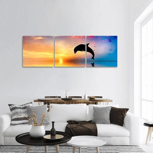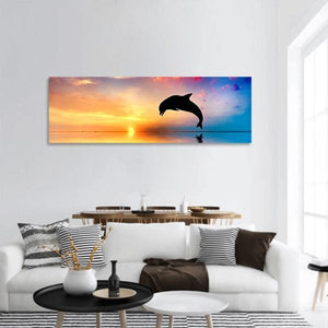 A silhouetted dolphin jumps above calm water at sunset, painted in orange, blue and pink for a serene yet dynamic feel. The minimalist, modern composition — with a rule-of-thirds layout and gentle water reflection — creates a peaceful focal point that suits modern and minimalist interiors.