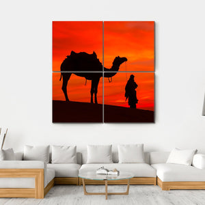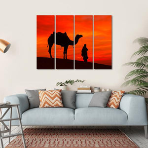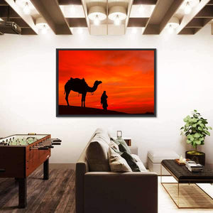 This canvas art captures a tranquil scene from Rajasthan's desert, showcasing a silhouette of a camel and its rider against a dramatic sunset. The rich palette of orange, red, and black evokes a serene and peaceful atmosphere, making it a striking addition to any wall decor.