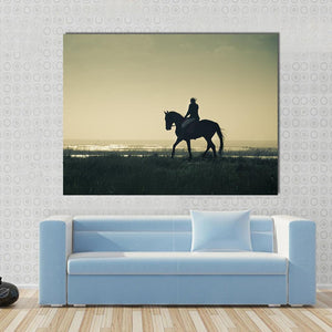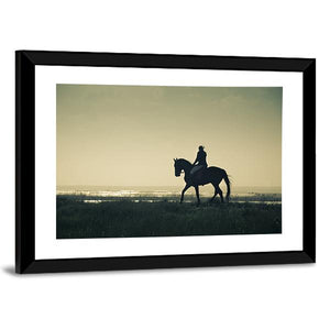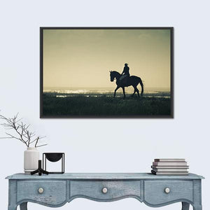 Capture the serene beauty of a horse and rider silhouetted against a tranquil landscape. This art piece evokes a sense of nostalgia with its vintage flair, featuring a calming palette of sepia and greens that harmonizes beautifully with various decor styles.