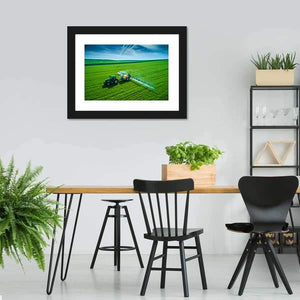 An aerial, wide-shot landscape of a tractor spraying a farm field, shown in greens, blues, yellows and white. The scene feels agricultural, industrious and vibrant, with visible lines in the field that suggest motion. Works well with modern home decor and room displays.
