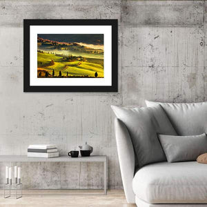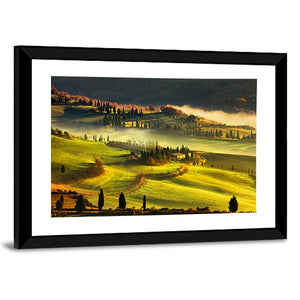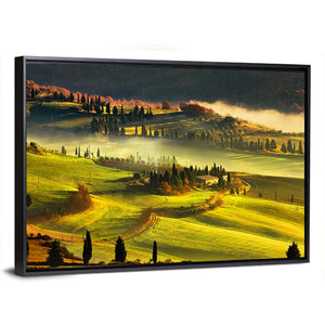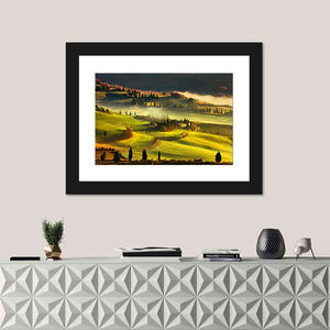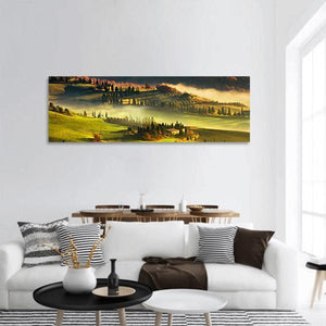 This beautiful canvas captures the tranquil essence of Tuscany, featuring rolling hills and lined cypress trees emerging through a gentle fog. The soft palette of greens, golds, and browns invites a serene atmosphere into your space.
