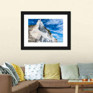 Mons Klint Cliffs Canvas Wall Art depicts a dramatic white cliff face against a clear blue sky with green foliage. The composition follows the rule of thirds, with wispy clouds and soft gray tones for a bright, natural, serene mood. It suits modern or nature-inspired interiors and provides a calm, scenic focal point.