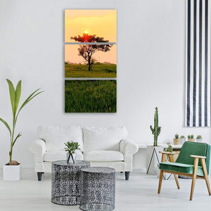 Sun Behind Tree Canvas shows a single tree silhouetted against a setting sun over tall grass in a field. Warm green, orange, yellow and brown tones give a serene, tranquil mood that fits nature-focused or modern room decor.