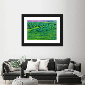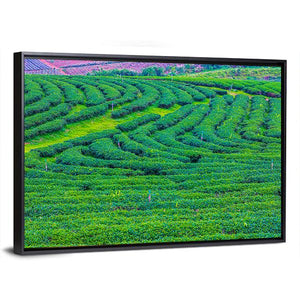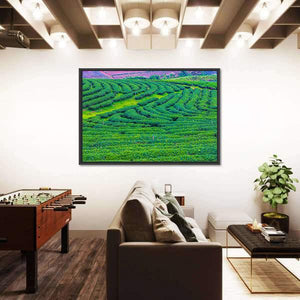 This photorealistic canvas shows a tea plantation in Thailand with neat rows of tea bushes stretching across rolling hills. Bright greens with touches of yellow, purple and brown give the scene a peaceful, vibrant feel. It fits modern home decor, such as living rooms or home offices seeking a natural focal point.