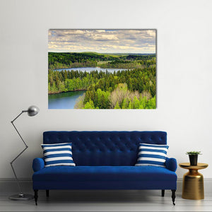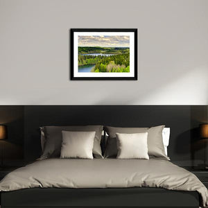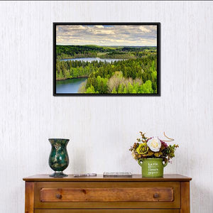 Bring the serene beauty of Finland indoors with this landscape canvas featuring a high-angle view of lush forests, calm lakes, and rolling hills. The natural palette of green, blue, and gray evokes a peaceful atmosphere, making it a wonderful addition to any space.