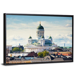 This canvas print features the Helsinki Cathedral, showcasing its striking green domes against a backdrop of colorful rooftops and a bright sky. The peaceful and scenic vibe makes it a charming addition to any space.