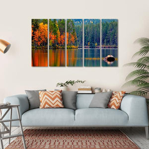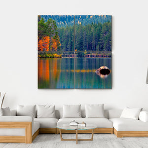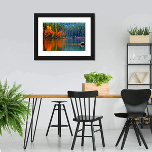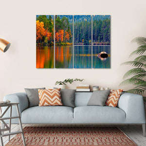 This canvas art captures the serene beauty of a lake surrounded by vibrant autumn trees and a lush pine forest. With vivid reflections on the water, it invites a tranquil atmosphere to any space, perfect for nature lovers.