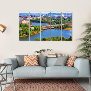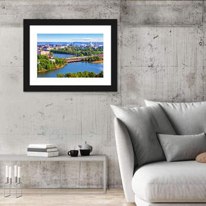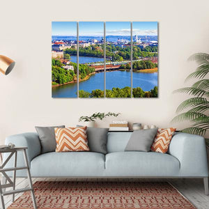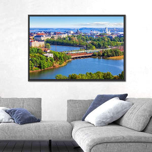 Experience the vibrant charm of Helsinki with this captivating canvas art featuring a lively cityscape. Showcasing a picturesque view of trees, buildings, and a train crossing a bridge, it brings a sunny, urban feel to your space.