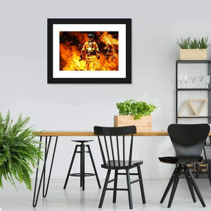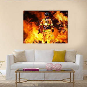 This firefighter canvas wall art centers a photo-realistic firefighter in full protective gear, holding an axe and a tool amid intense flames. The dramatic orange, yellow, black, white, and grey palette gives the scene an intense, heroic mood. Suits modern home room decor that welcomes bold imagery.